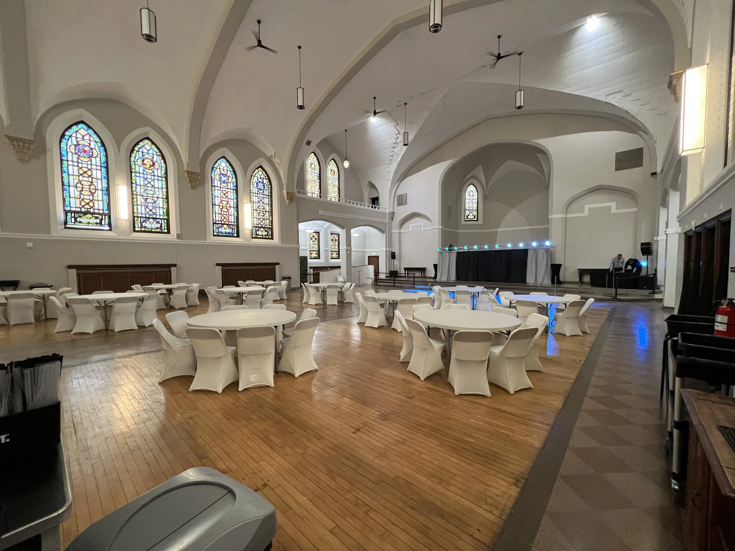 Indoor weddings offer consistency. That matters when you are wearing formal attire and hosting a large group. Our building was restored beginning in 2019 after sitting unused for nearly two decades. The original architecture remains a focal point, including stained glass windows that create a natural sense of ceremony as soon as guests arrive. That visual character is one reason couples choose us when they want a setting that already carries meaning without heavy decorating.